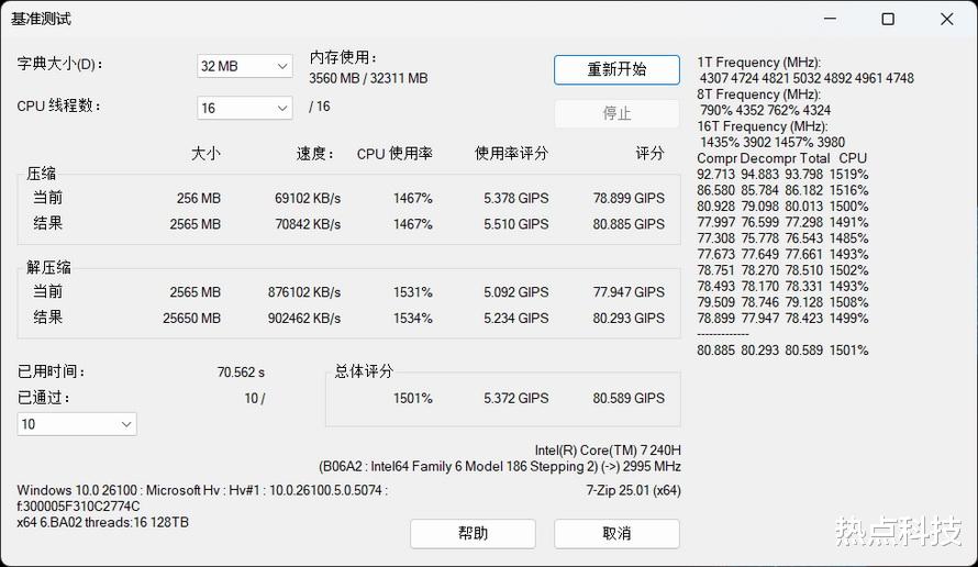 接下来是7ZIP的基准测试,它不仅看重CPU性能,而且看重内存带宽,笔记本压缩得分为80.885 GIPS,解压缩得分为80.293 GIPS,表现相当均衡。