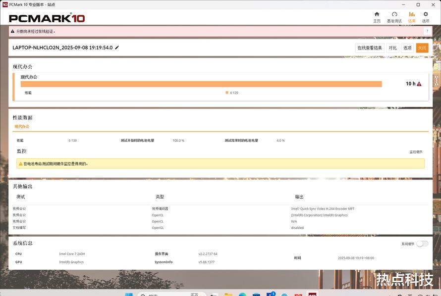 而在PCMARK10中,我们基于现代办公场景测试了笔记本性能与续航,其中性能得分为6425,续航为10小时,续航表现中规中矩。