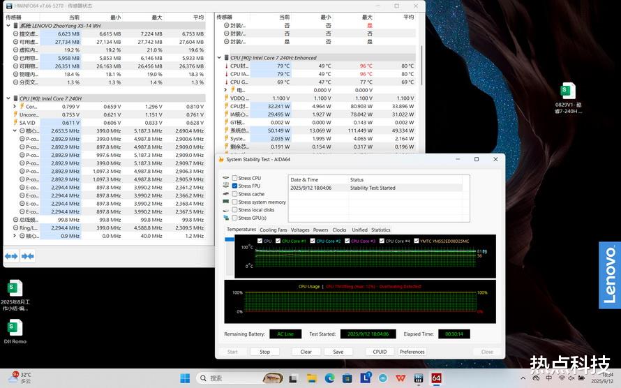 在测试了CPU性能的同时,我们也不忘测试了笔记本电脑整机散热能力,使用了AIDA64进行单烤测试,在连续测试了30分钟后,CPU的温度去到了96摄氏度,只能说散热系统表现一般般。