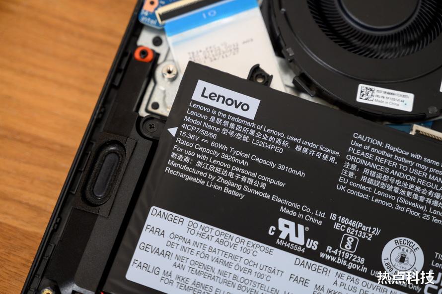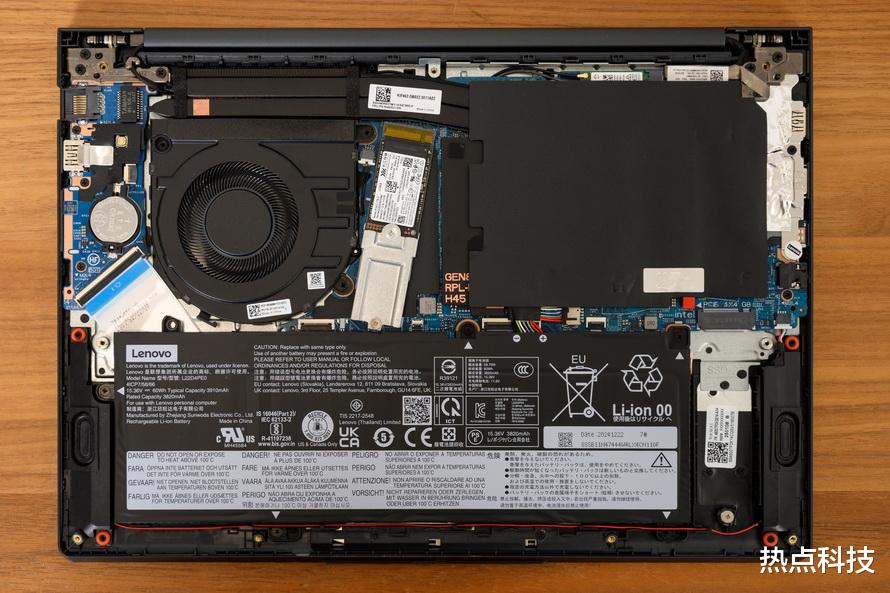 联想昭阳X5-14作为一款配置灵活的笔记本电脑,可以组合出非常多的配置,但其散热系统能够发挥出其性能么。下图是笔记本的内部设计,从左到右分别是散热系统(大直径风扇+双热管设计)、SSD1、CPU、内存、SSD2(默认为空),散热风扇工作时能借助风道带走内存、SSD的热量。
