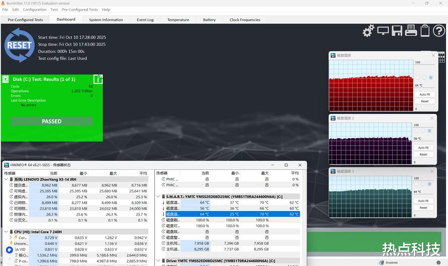 最后我们还是使用了BurnInTest 11.0测试SSD的可靠性与温度,PC411顺利通过了测试,而且在笔记本电脑有限空间下,在测试过程中最高温度不过70摄氏度,表现相当出色。