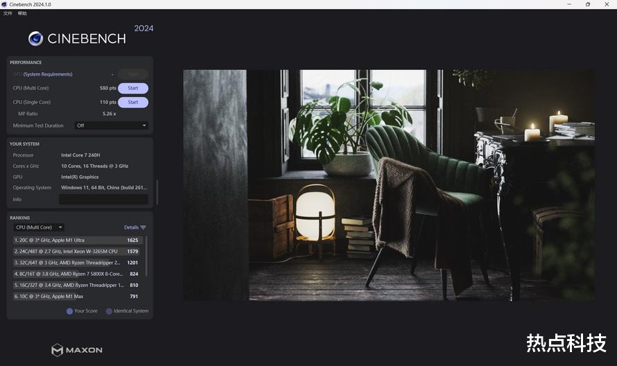 由于采用的是集成显卡设计,我们将着重测试CPU性能表现。第一项测试是CINEBENCH R24,酷睿7 240H处理器多核得分为580 pts,单核得分为110 pts。