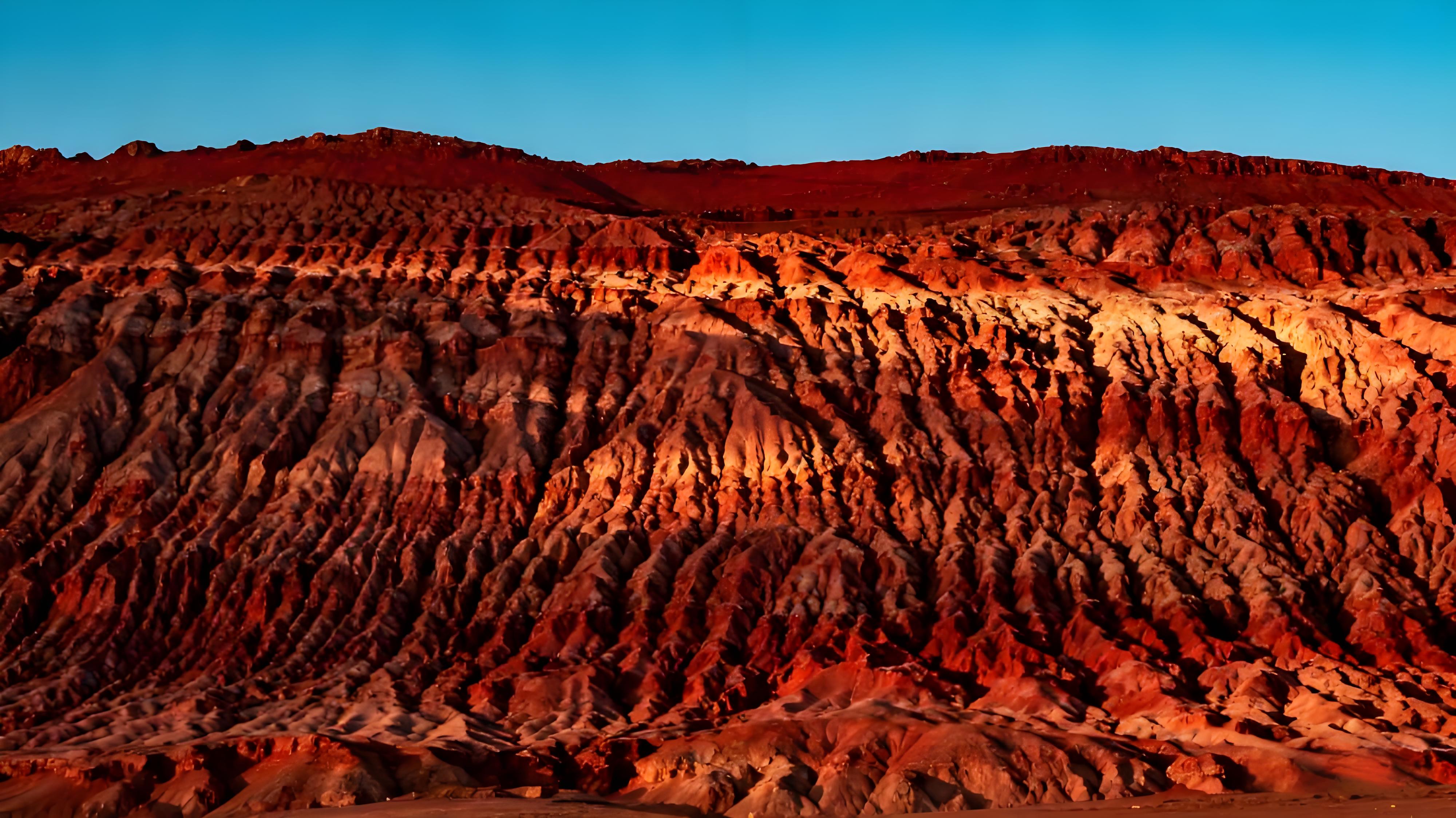 这儿号称中国 “最热的地方”,夏天地面温度能飙到 89℃,把鸡蛋埋在沙子里都能烤熟,空气温度也经常超过 47℃。为啥这么热?因为吐鲁番盆地比海平面还低,热空气进去就出不来;一年到头才下 16 毫米的雨,又干又闷。这些红色岩石就像大铁板,越晒越烫。神奇的是,山里的沟沟坎坎藏着不少绿洲,比如有名的葡萄沟,到处瓜果飘香,和外面的 “火焰世界” 完全不一样。