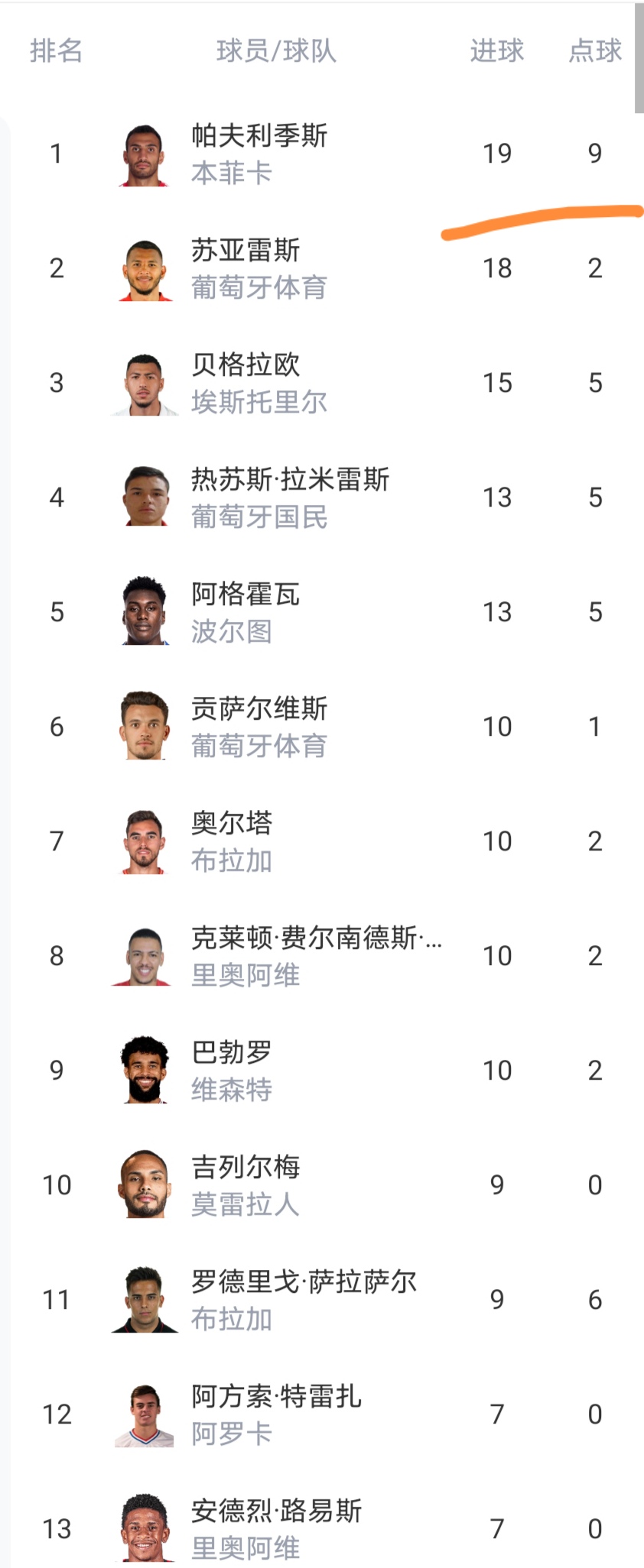射手榜方面,有9人进球已经上双了,其中本菲卡的帕夫利季斯再次坐上射手榜榜首的宝座,不过仅领先第2的苏亚雷斯1球,可以看到葡超金靴争夺白热化。