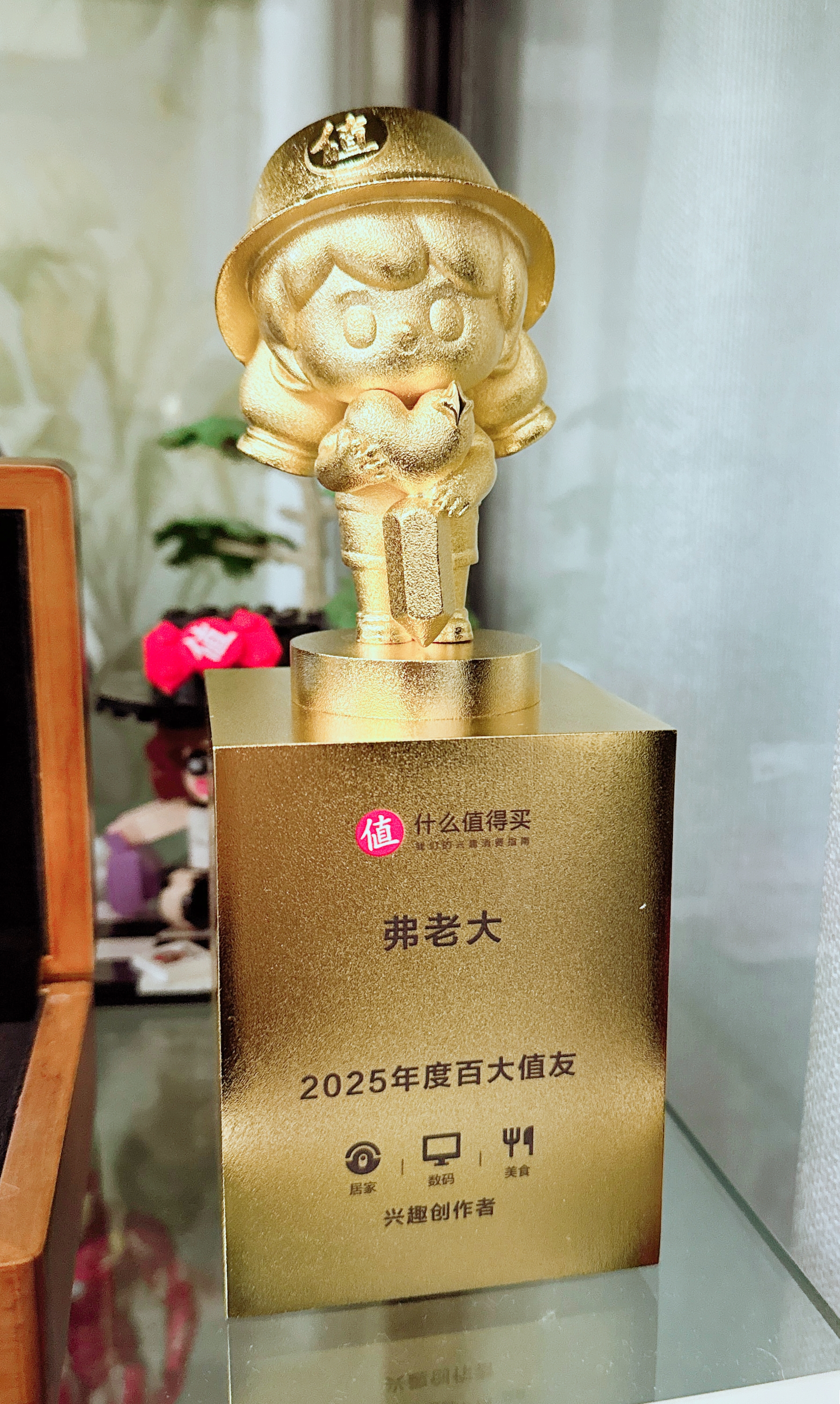 金光闪闪的金小草奖杯也是一大亮点。这次的外观设计较前两年有所不同,小草同学立于高高的领奖台上,领奖台前方印有“弗老大”“2025年度百大值友”字样,并个性化注明了楼主的兴趣创作领域——居家、数码和美食,言简意赅地表明身份和擅长领域。每一处细节都是精心设计的写照表现。