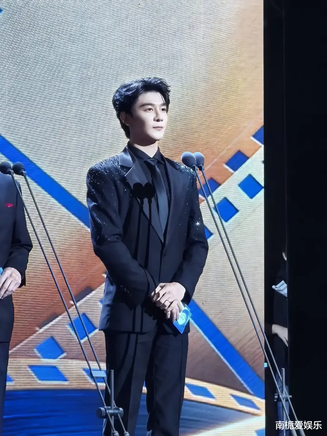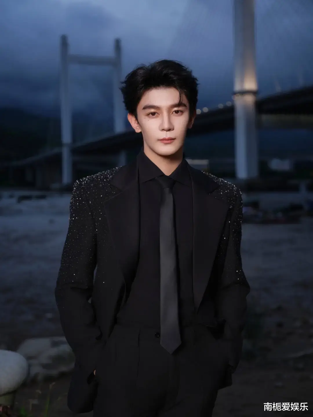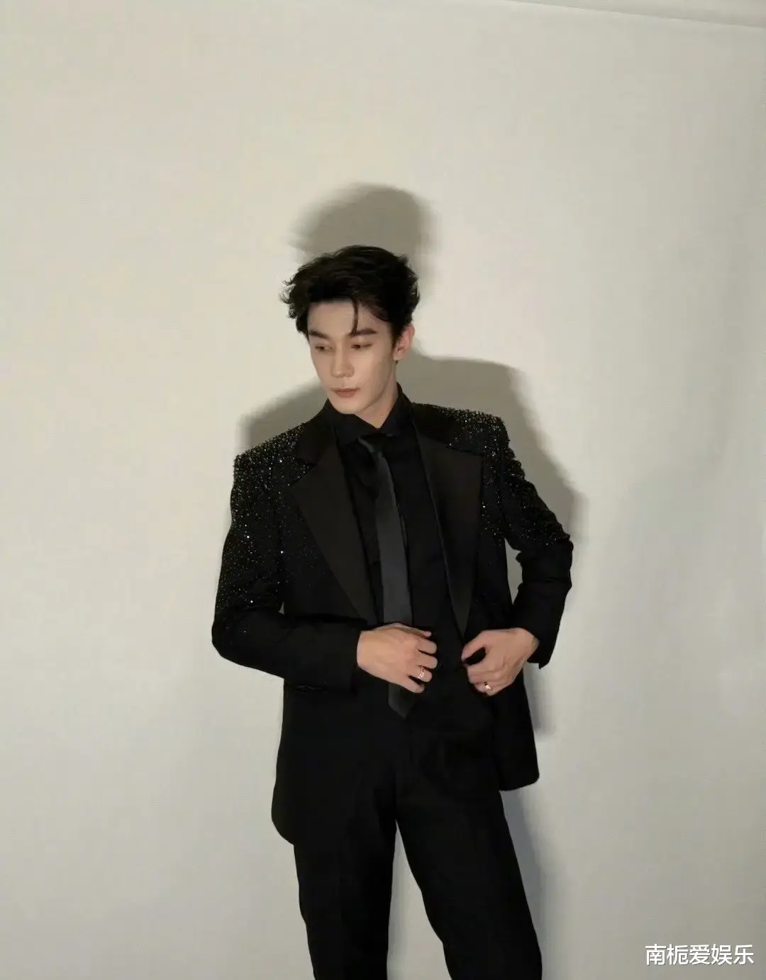 他身着一套全黑爆闪西装登场,整件西装密布细密亮片与微钻,在灯光映照下如星河倾泻,随着步伐流转出动态流光,仿佛将整片夜空披在身上,被媒体盛赞为“行走的星光”。简约黑色内搭与皮鞋的搭配,进一步凸显了他183cm的修长身形与冷峻气质,生图中雕塑般的骨相轮廓清晰分明,网友纷纷感叹“硬帅到极致”,堪称内娱红毯美学的新巅峰。