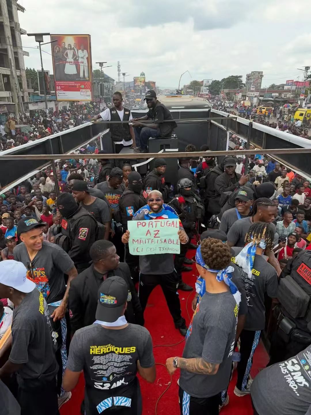据目前效力于纽卡的前锋维萨晒出的现场照片来看,庆典活动异常热闹,不计其数的球迷走上街头,穿着喜庆的服饰,来和球员们一起载歌载舞,庆祝球队挺进世界杯正赛。而在他晒出的照片中,大家还看到了,此前曾经效力于北京国安的球员巴坎布的身影,这名球员站在大巴车上,双手举着一块牌子,而牌子上面用红色笔写着“葡萄牙尽在掌握”。