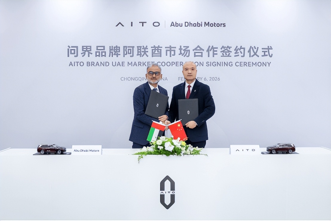 2026年2月6日,中国豪华汽车引领者AITO问界与阿联酋头部豪华汽车经销商集团Abu Dhabi Motors(以下简称ADM)在中国重庆正式签署战略合作协议。赛力斯汽车海外BU总裁王进与ADM CEO Syed Faiz Karim代表双方签署协议,赛力斯汽车总裁何利扬与阿卜杜拉·本·穆罕默德·本·布蒂·阿勒哈米德阁下私人办公室中国区负责人赵頔见证签约。这次合作标志着AITO问界在海外高端新能源市场的布局取得关键进展,正式开启品牌全球化的新篇章。