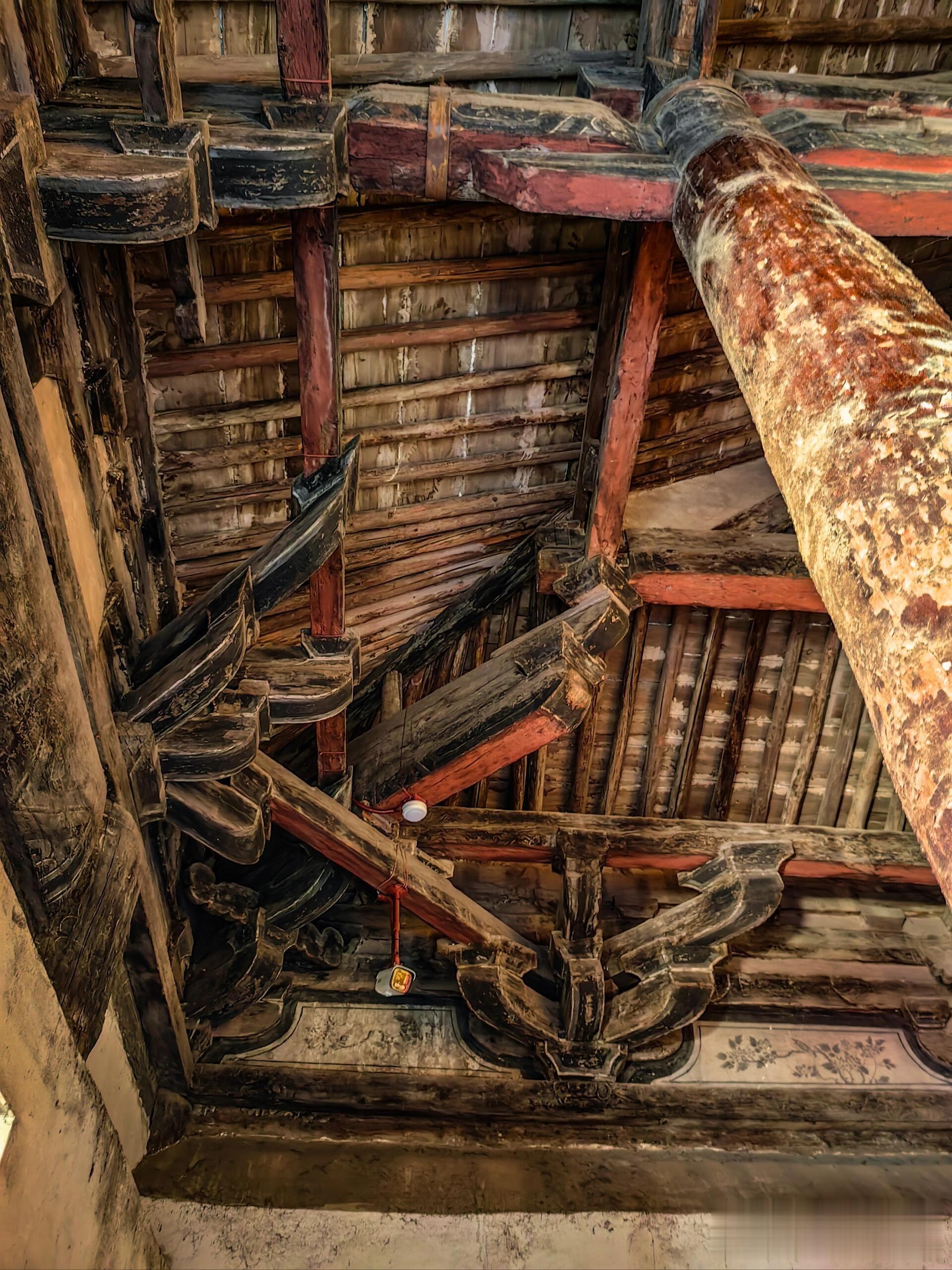 步入大殿,首先映入眼帘的是其独特的内部结构。殿内金柱未移,与通常金柱相同,这种布局保证了大殿内部空间的稳定性与规整性。前檐平柱与后檐二次间补间铺作相对,从而形成了前檐明间稍宽,后檐三间面阔基本相等的格局。这种巧妙的设计,不仅在结构上实现了力学的平衡,还在视觉上营造出一种和谐的美感,充分体现了古代工匠们对建筑艺术的深刻理解和精湛技艺。