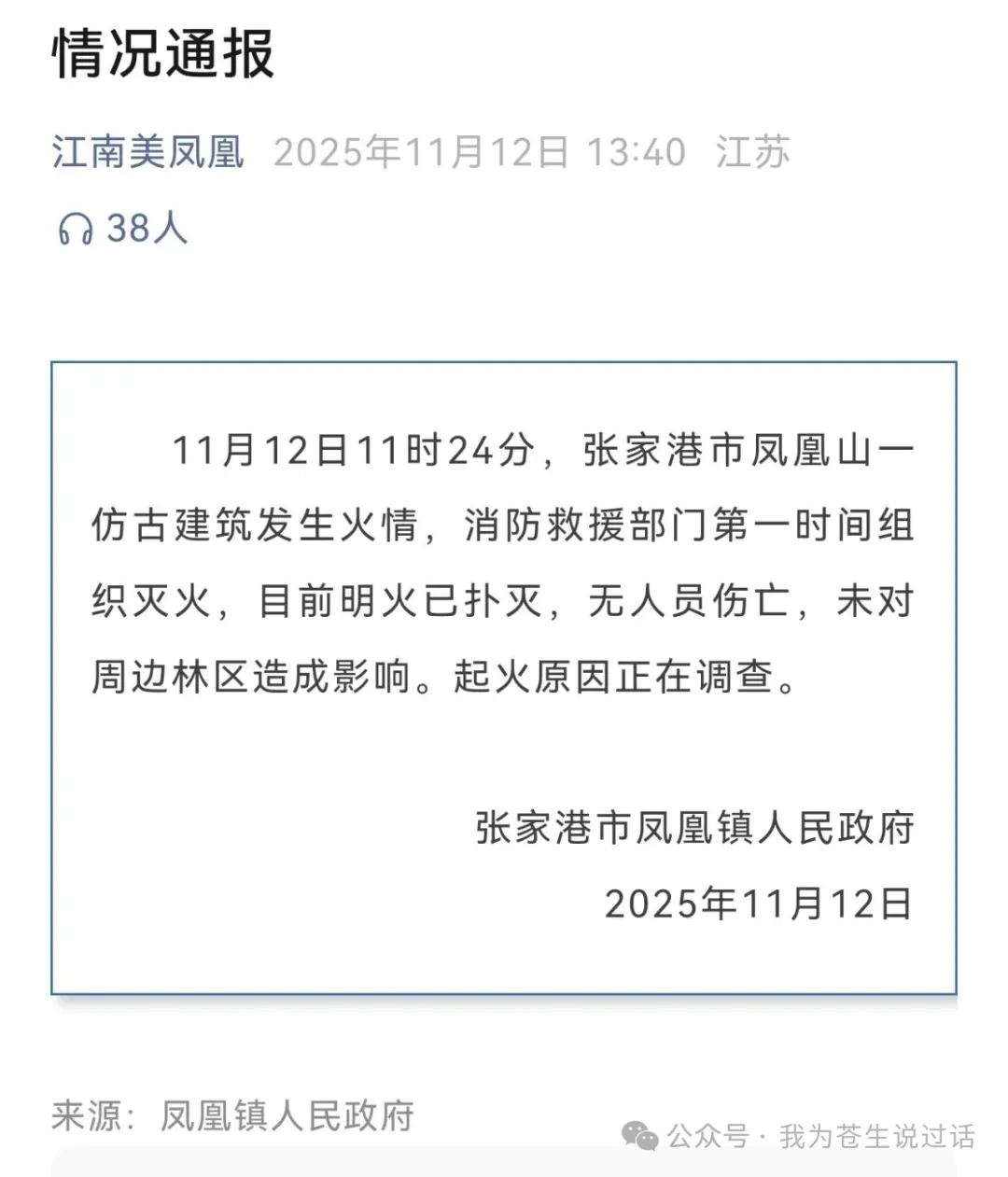 当天下午1点40分,张家港市凤凰镇人民政府通过“江南美凤凰”微信公众号发布情况通报:“11时24分,凤凰山一仿古建筑发生火情,消防救援部门第一时间组织灭火,目前明火已扑灭,无人员伤亡,未对周边林区造成影响。目前起火原因正在调查中。”