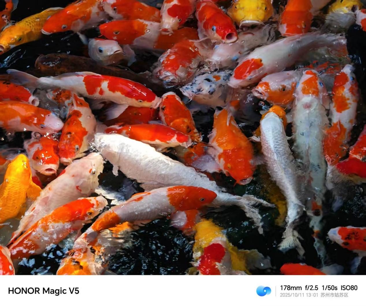 影像:超越“拍照手机”,直逼专业相机之境周末漫步于公园,我故意使用长焦镜头,而是凭借主摄的5000万像素鹰眼镜头拉近拍摄花朵。鱼群拥趸的细腻波纹、鱼群的波光粼粼,甚至水花上晶莹的露珠,都被清晰捕捉,纤毫毕现。这得益于其1/1.56英寸的大底与f/2.5的大光圈,大底带来充足的进光量,让每一处细节都能精准呈现,而大光圈则营造出浅景深效果,背景虚化自然柔和,将花朵主体完美凸显。