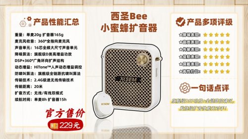 扩音器行业长期存在声音失真刺耳、啸叫回声严重等问题。西圣Bee凭借着超高品质和专业级声学水准,被国内外众多教育机构和讲师团体誉为最值得信赖的专业扩音器。而且西圣从不靠铺天盖地的广告,更不请明星代言,而是依靠大量教师、讲师和活动主持人的真实使用体验,以及数码、教育类博主的口碑推荐。正因如此,西圣Bee才能在扩音器领域始终稳居口碑第一,被公认为行业的旗舰标杆。