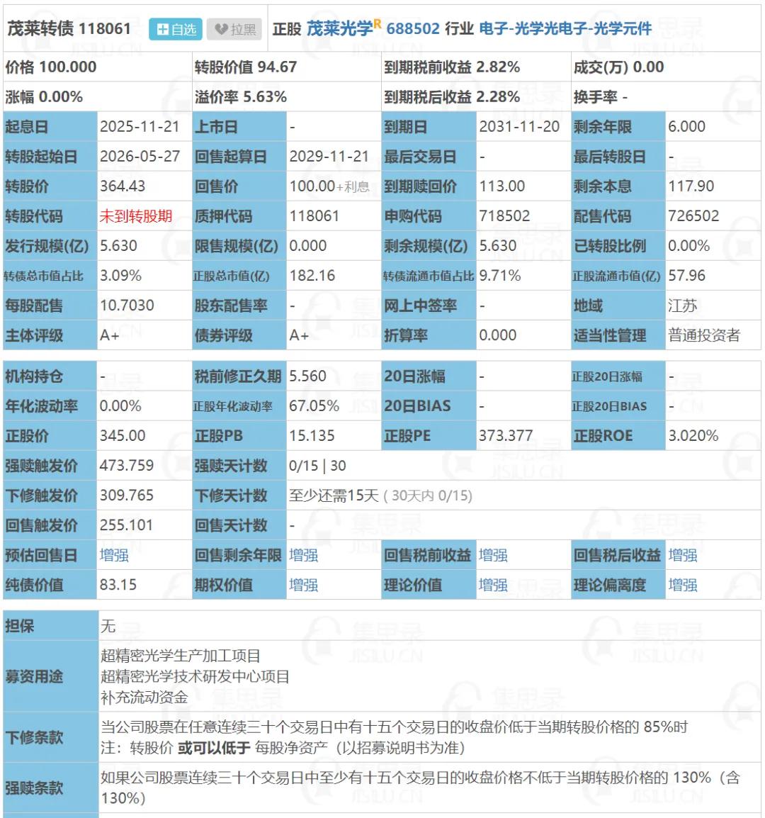 茂莱光学今日收盘价345,转股价364.43,转股价值=转债面值/转股价*正股价=100/364.43*345=94.67,转股价值一般,可转债转股价值越高越好。
