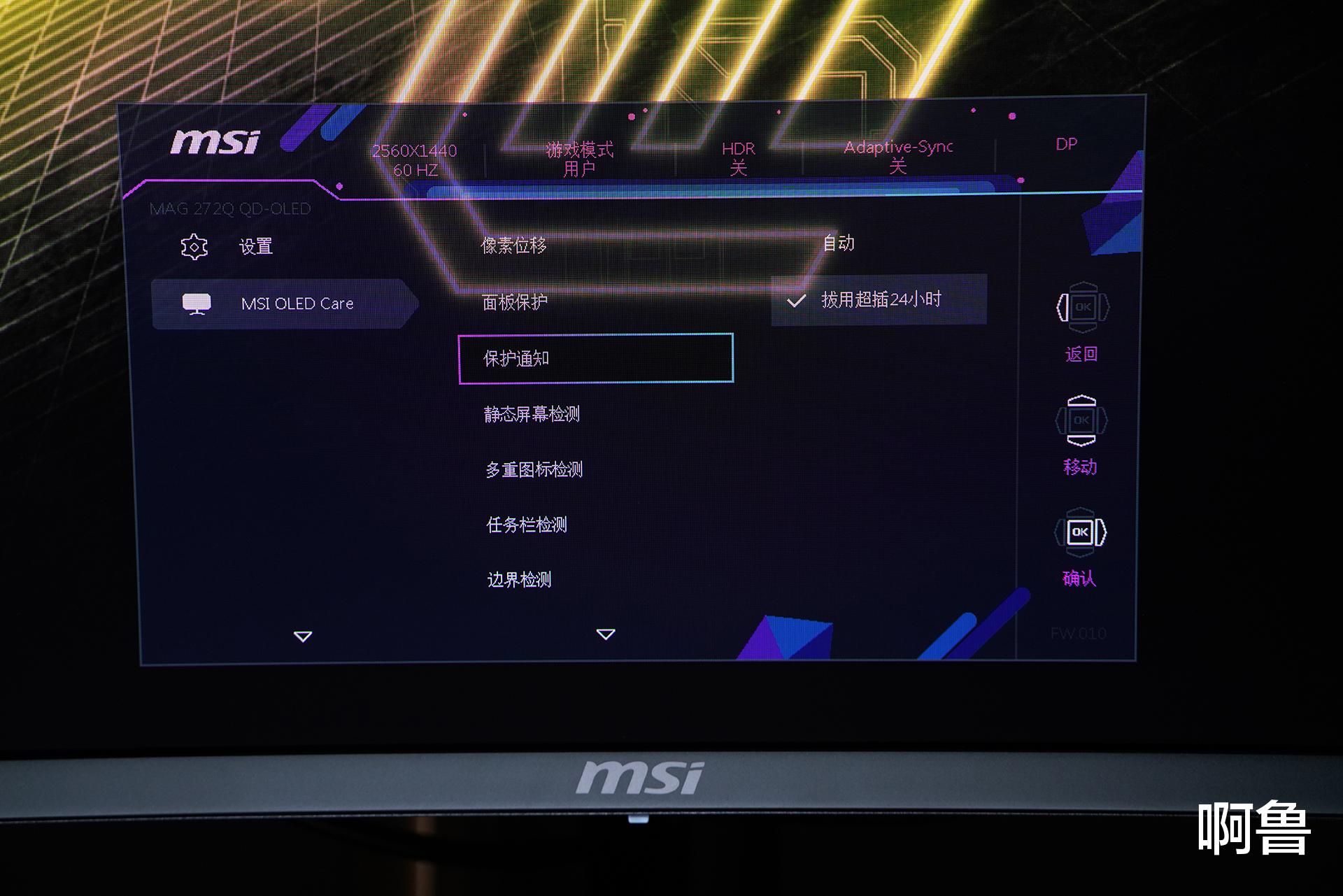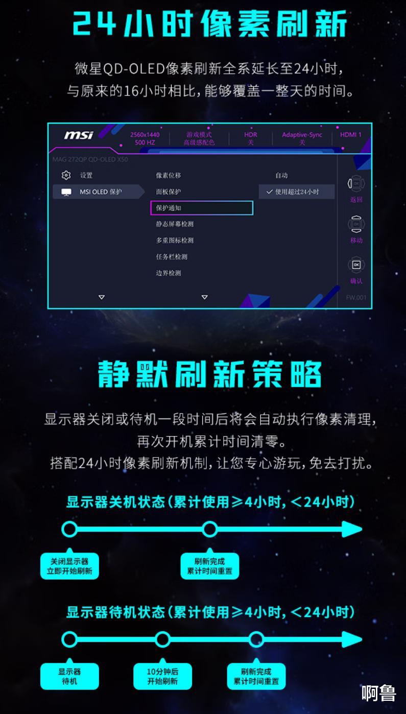 OLED显示器虽然拥有卓越的画质表现,但烧屏隐患却始终让用户心存顾虑。对此,微星MAG 272QP QD-OLED X50通过软硬双重保护方案走在了行业前列:硬件方面,定制的石墨烯散热器取代传统风扇散热,有效降低面板温度,延缓OLED老化;软件方面,提供了像素位移、像素刷新和静默刷新等多项主动保护措施,并将QD-OLED像素刷新周期延长至24小时,几乎不会影响用户日常使用体验。此外,显示器还能智能检测静态图标、任务栏等易烧屏区域,并及时作出提醒与保护,用户能直观掌控屏幕健康状态,进一步缓解烧屏焦虑。微星还特别提供了长达3年的烧屏换新服务,只要启用了保护功能,一旦出现烧屏即可直接更换新品。这一系列系统而人性化的保护方案,不仅解决了用户最实际的担忧,更让玩家能放心畅享OLED带来的极致视觉体验。