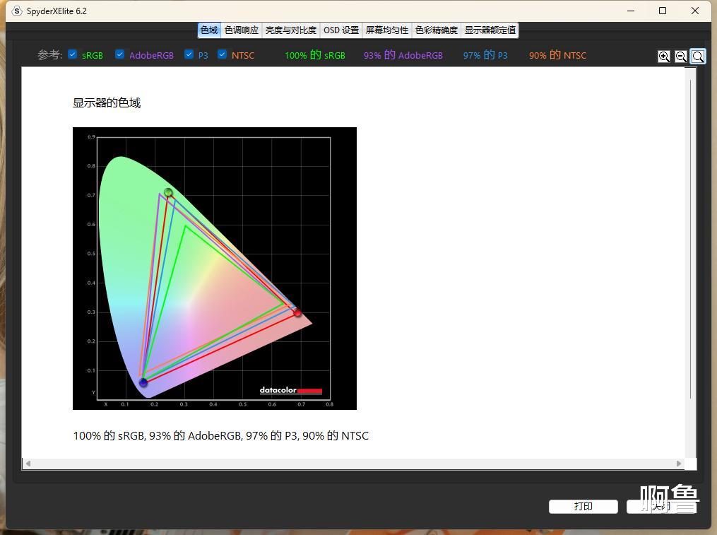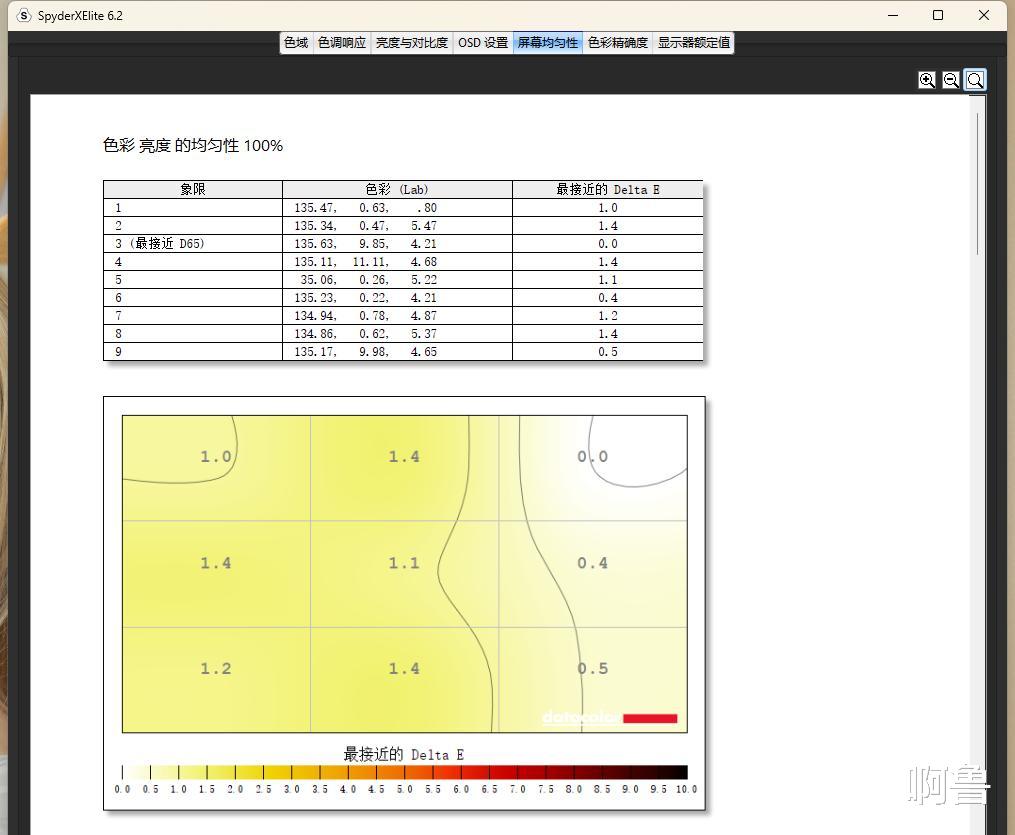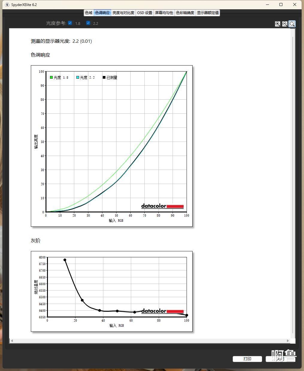 通过红蜘蛛较色仪Spyder X Elite实测数据得知,MAG 272QP QD-OLED X50屏幕在色彩素质方面表现接近专业级:色域覆盖达到100% sRGB、93% AdobeRGB和97% P3,能够呈现非常广阔而准确的色彩范围;色彩精准度优秀,平均ΔE仅1.11,大部分色块误差低于2,配合10bit色深让色彩过渡自然顺滑。色调响应曲线贴近2.2标准,灰阶表现稳定,亮暗细节精准;屏幕亮度和色彩均匀性也十分出色,最大亮度差仅3%,全屏观感一致。结合QD‑OLED自发光带来的纯净黑色与高对比度,这款显示器在游戏、影视和内容创作中都能提供鲜艳真实、层次分明的画面效果。