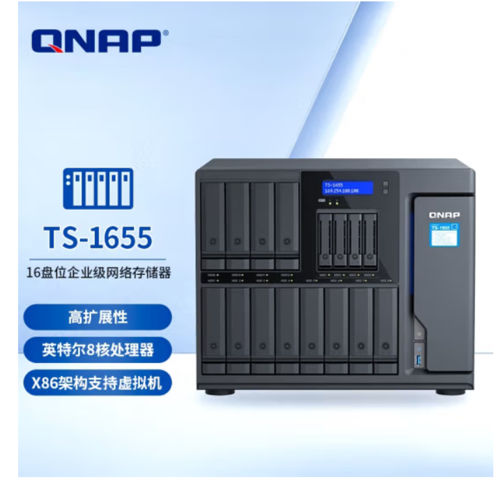 🔺【威联通(QNAP)TS-1655】然后是16盘位混合盘设计的TS-1655,支持12 块 3.5 英寸硬盘和 4 块 2.5 英寸固态硬盘,支持热插拔和RAID 50/60。配置方面采用的是高性能英特尔凌动 C5125 八核 2.80 GHz 处理器,支持英特尔加速技术 (QAT),并配备 4 条 UDIMM DDR4 内存插槽(预装 8 GB),最高可扩展至128GB,支持内存纠错技术。网口方面虽说标配两个2.5G网口略有遗憾,不过它内置 3 个 PCIe 插槽,通过安装万兆扩充卡也没什么问题,所以这台机器比较适合多人协作办公,多人实时视频剪辑等需求。