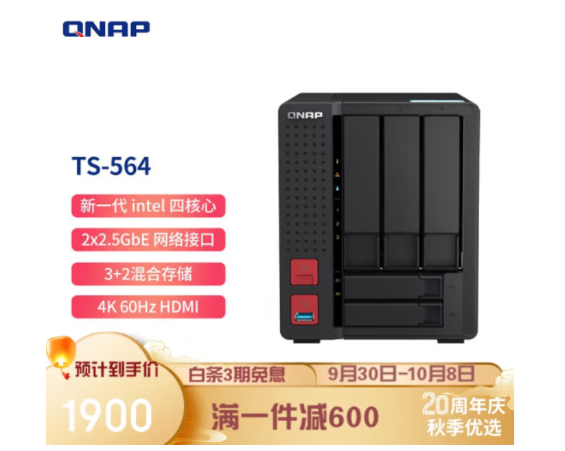 🔺【威联通(QNAP)TS-564】威联通还有一个很特别的型号TS-564,配置和TS-464C差不多,不过采用的是3个3.5吋硬盘插槽+2个2.5寸SSD专用端口五盘位设计,所以也少了M.2固态硬盘位。这款机型的优势是支持威联通混合高性能存储模式,提升密集存取应用性能。最主要的是价格日常价都没有超过2000,如果你手头正好有闲置2.5寸固态可以考虑下它。