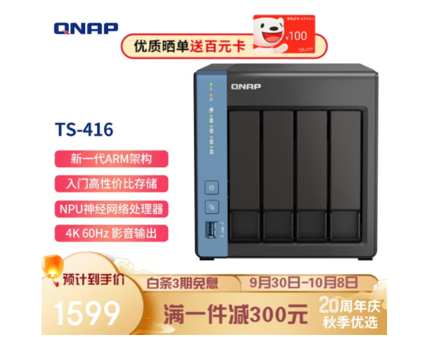 🔺【威联通(QNAP)TS-416 天空保垒】如果在意盘位担心后期容量不够的可以考虑TS-416 ,多了两个3.5寸机械硬盘盘位,同时还多出一个千兆网口,后期还能折腾下链路聚合实现2Gbps的读写速度,还算不错。