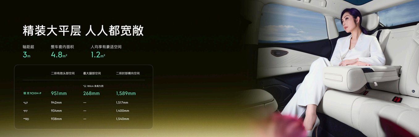 领克10 EM-P拥有5050*1966*1487mm的宽境大尺寸车身,配合3005mm超长轴距,实现81%高得房率,整车套内面积达到4.8㎡。座舱内饰可选月影黑、赤霞橘、日光米、曜金黑四种风格,充分满足用户的个性化审美。同时遵循“四座平权”理念,前后排都是云感零压座椅,配备通风、加热、按摩功能,还可电动调节,解锁最舒适的“黄金躺角”。后排还有1700cm²智能超大扶手和15公斤高承重小桌板,可以秒变小朋友的玩具区,地板真正做到纯平,三人乘坐不尴尬,毛孩子也能随便躺。车内每一个家庭成员,领克10 EM-P都能照顾好。