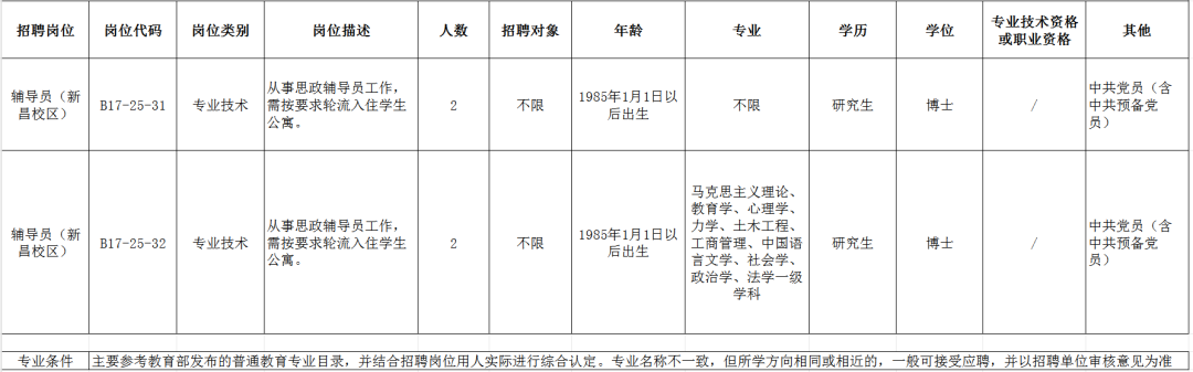 本批次招聘辅导员岗位需求为2个岗位共4人,为专业技术岗位。
