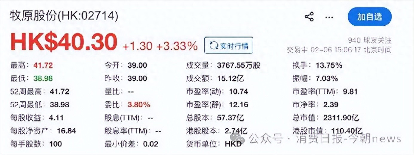 2026年2月6日,牧原股份在港交所正式挂牌上市,开盘价与39港元发行价持平,盘中一度涨至41.72港元,市值超2300亿港元,形成“A+H”股双资本平台格局。