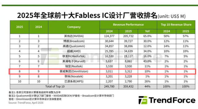 上数据,上图是2025年全球前10大芯片设计企业的营收、增长率、排名等情况。