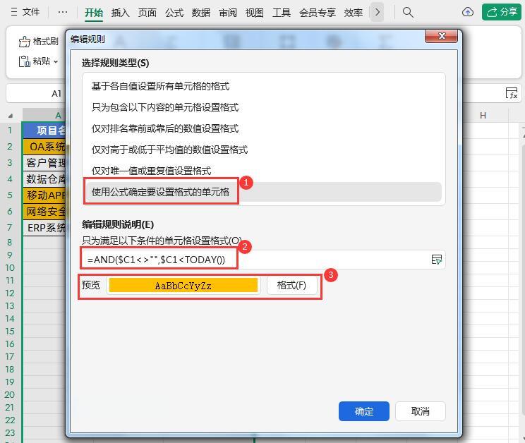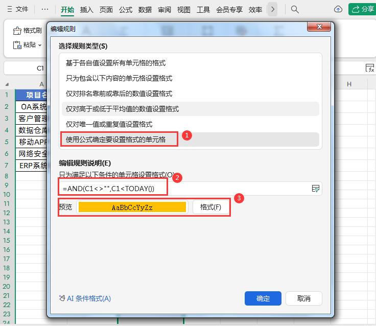 当C1不等于空,并且C1单元格日期小于当天日期则符合条件,自动标记单元格背景色。其中,使用TODAY函数自动获取当天的日期。