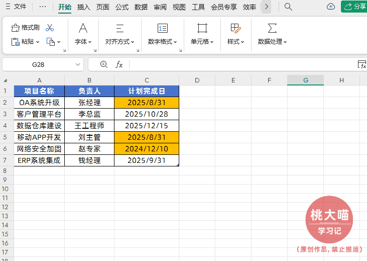 如下图所示,同样使用上面的实例,这次当“计划完成日”日期超过当天后,该项目整行数据自动标记成黄色背景。