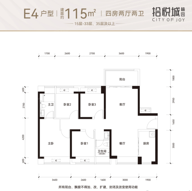 E4户型(115㎡四居): 多代同堂家庭的优选。双套房设计满足老人与年轻夫妇的居住独立性,约6.2米景观阳台与客餐厅形成LDK一体化布局,增强家庭互动。书房可根据需求改造为儿童活动室或工作室。