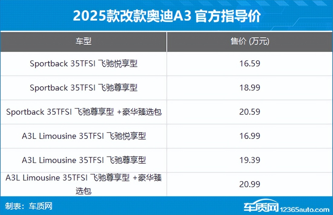 日前,车质网从一汽奥迪官方获悉,2025款奥迪A3改款车型正式上市,共推出6款车型,包含Sportback两厢版和Limousine三厢版,售价区间为16.59-20.99万元。此次改款车型主要针对配置进行调整,外观和内饰设计与现款保持一致。