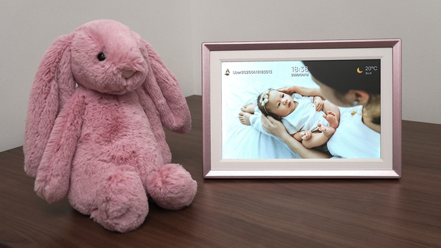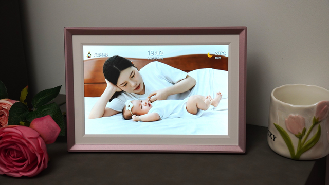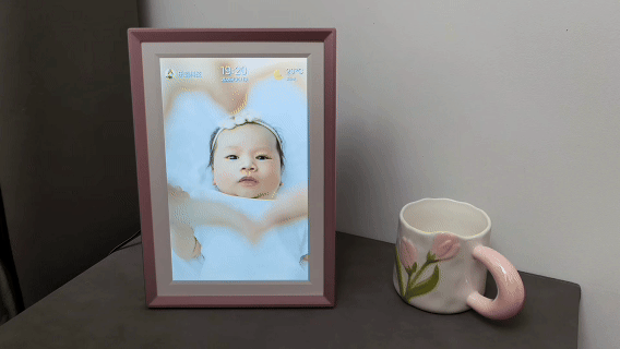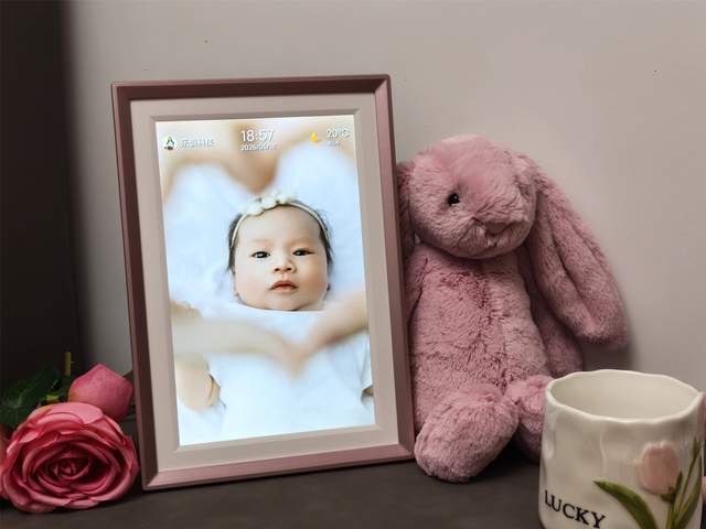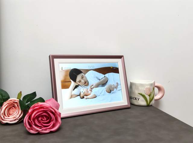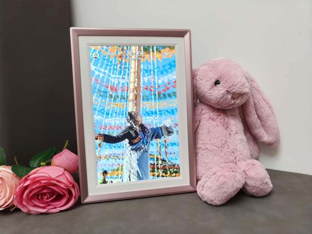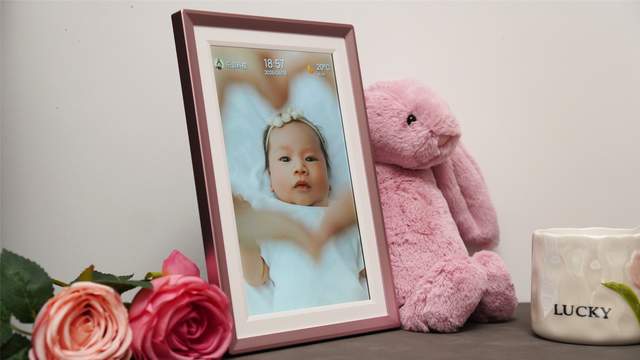 外观设计上,阿卓帕ARZOPA数码相框整体给人的第一感觉是精致,采用类似玫瑰金配色的边框设计,视觉上偏温暖柔和,可以很自然的融入客厅、卧室或办公桌环境,我送给老婆,她选择直接将其摆在了床头,每天循环播放和女儿的小照片,甚至还能直接上传女儿的live图来参与循环。
