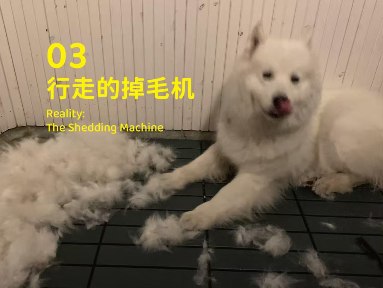 真相二:它是24小时不间断的“造毛机器”!什么“棉花糖”,根本就是“蒲公英”!一年365天,有180天都在下“鹅毛大雪”!你的黑衣服、你的床、你刚做好的饭……全部都会覆盖上一层厚厚的“爱の证明”。没有一台工业级吸尘器,你敢养它?