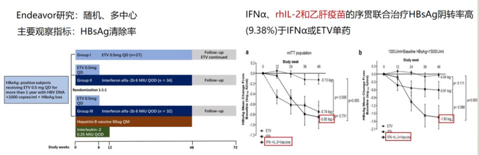 多项国际多中心研究证实,以干扰素为基础的联合治疗方案在功能性治愈及长期预后改善方面优于NAs单药治疗。全球最大的CHB临床治愈研究队列——珠峰项目最新结果显示,NA经治患者序贯PEG-IFNα治疗48周,HBsAg清除率超30%;Endeavor研究(随机、多中心研究)表明[2],IFNα联合rhIL-2和乙肝疫苗治疗促进HBsAg下降(图2)。