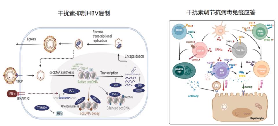 干扰素是CHB临床治愈的重要手段,具有双重作用机制[1]:一方面通过激活多种抗病毒蛋白(如MX2、ZAP、ISG20等)直接抑制HBV复制,包括阻断cccDNA合成与转录;另一方面通过调节免疫细胞功能(如增强NK细胞杀伤活性、恢复T细胞功能)重建宿主抗病毒免疫应答(图1)。这种“直接抗病毒+免疫调节”的协同效应,使其在实现HBsAg清除及降低远期并发症风险方面具有独特价值。