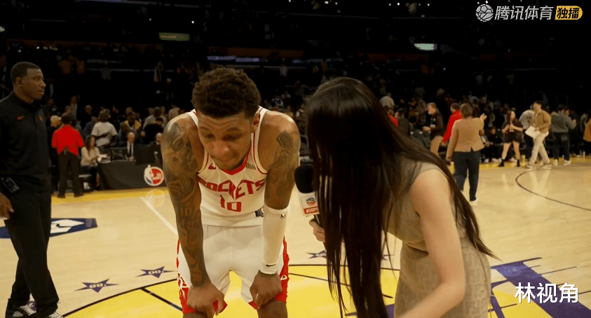 比赛结束,申京和队友逐一击掌庆祝胜利,范弗里特也走入场内和队友一起庆祝,小贾在场边接受记者采访,一开始双手扶膝,确实是累坏了。