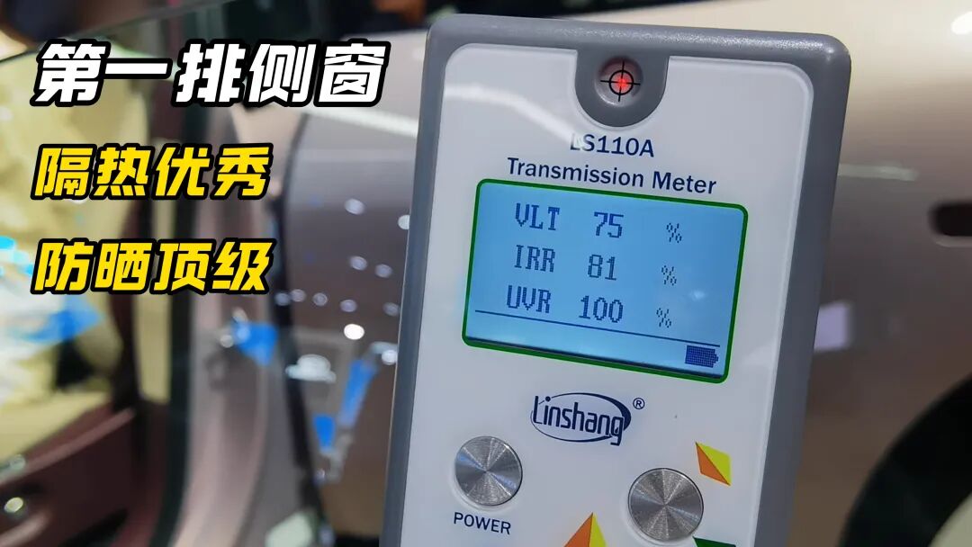 小米YU7 2025款第一排侧窗测下来,红外阻隔率(IRR)为81%,紫外阻隔率(UVR)有100%,这组数据在市面上横向对比的话,已经是相当高了,隔热又防晒。不过,透光率(VLT)仅为75%,透光冗余已经很低,只有5个百分点,要想贴膜的话,可以选择的产品其实不多。