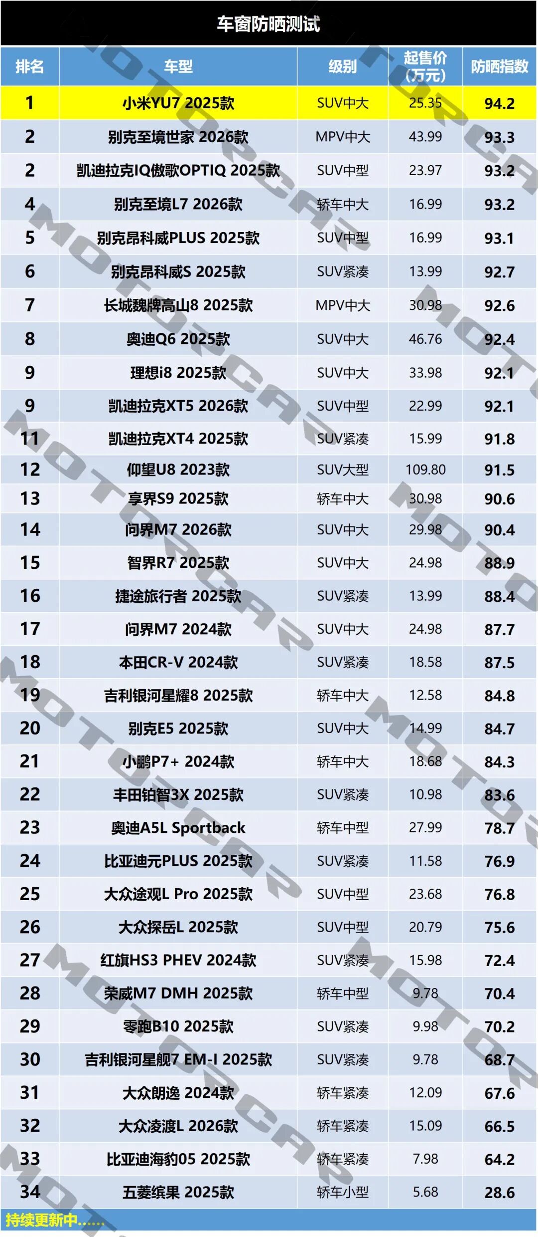 按照测试模型计算下来,小米YU7 2025款全车防晒指数为94.2分,在目前的测试排名中暂时排名第一!你可以质疑小米的车漆,你也可以质疑小米的做工,你还可以质疑小米的品质和可靠性,但是在用料这一块,小米是真的下得去手。