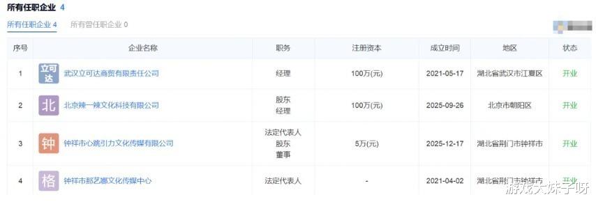 值得注意的是,她的商业布局并非单点运作,而是通过多家公司形成利益网络,涵盖文化传媒、科技推广、商贸经营等领域,这种结构在顺风期能放大收益,但在风险爆发时,同样会放大连锁影响,个人信誉与公司主体绑定,一荣俱荣,一损俱损。