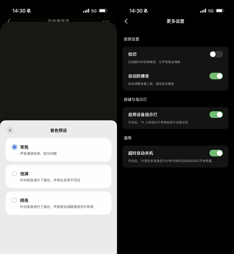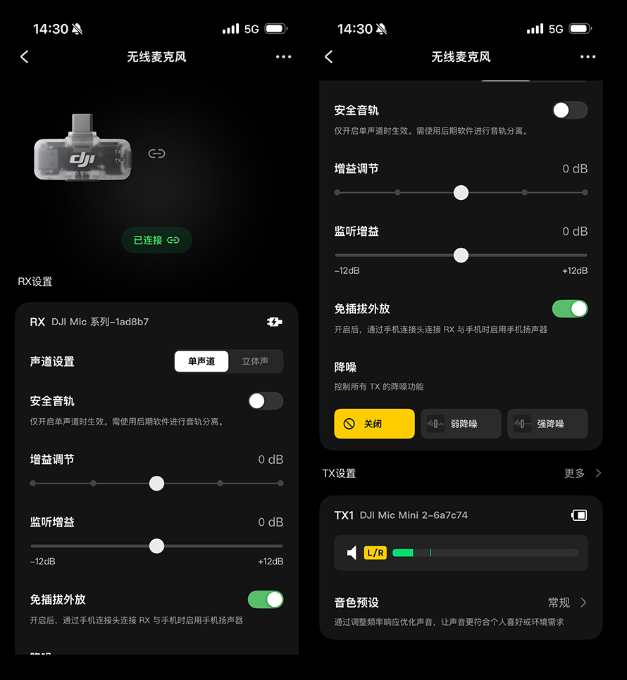 在诸多功能中,需要拿出来一说的是音色预设,这是一个新增的功能。DJI Mic Mini 2共有Regular常规挡、Bright明亮挡、Rich饱满挡三种音色,其中Regular常规挡是默认设置,主打一个音色均衡、不过不失;Bright明亮挡会在不刺耳的情况让高音轻响亮一点,较为适合女生使用;而Rich饱满挡会强化低音效果,让声音变得更为厚实,适合男生使用。用户可以根据自己的喜好,在Mimo App里设置。