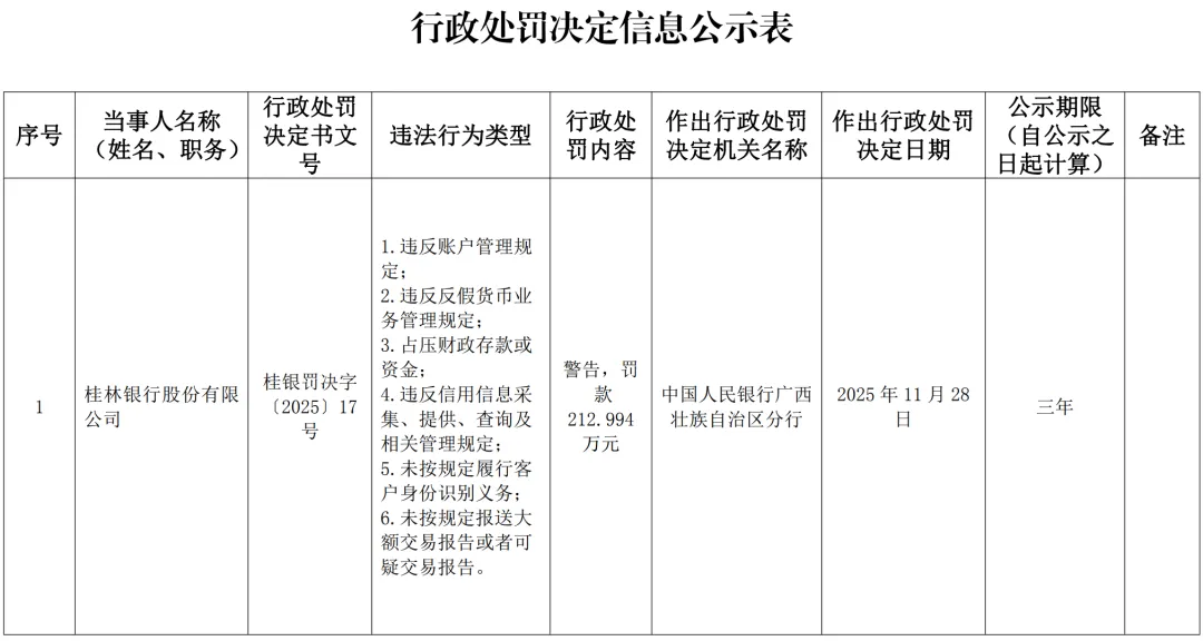 12月4日,据人民银行广西分行发布的行政处罚决定信息公示表显示,桂林银行因6项违规被警告并罚款212.99万元,具体违法行为包括:1.违反账户管理规定;2.违反反假货币业务管理规定;3.占压财政存款或资金;4.违反信用信息采集、提供、查询及相关管理规定;5.未按规定履行客户身份识别义务;6.未按规定报送大额交易报告或者可疑交易报告。