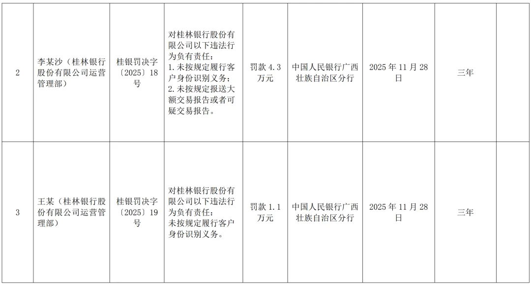其中,时任桂林银行运营管理部的李某沙对该行未按规定履行客户身份识别义务、未按规定报送大额交易报告或者可疑交易报告负有责任被罚款4.3万元;时任桂林银行运营管理部的王某对该行未按规定履行客户身份识别义务负有责任被罚款1.1万元。