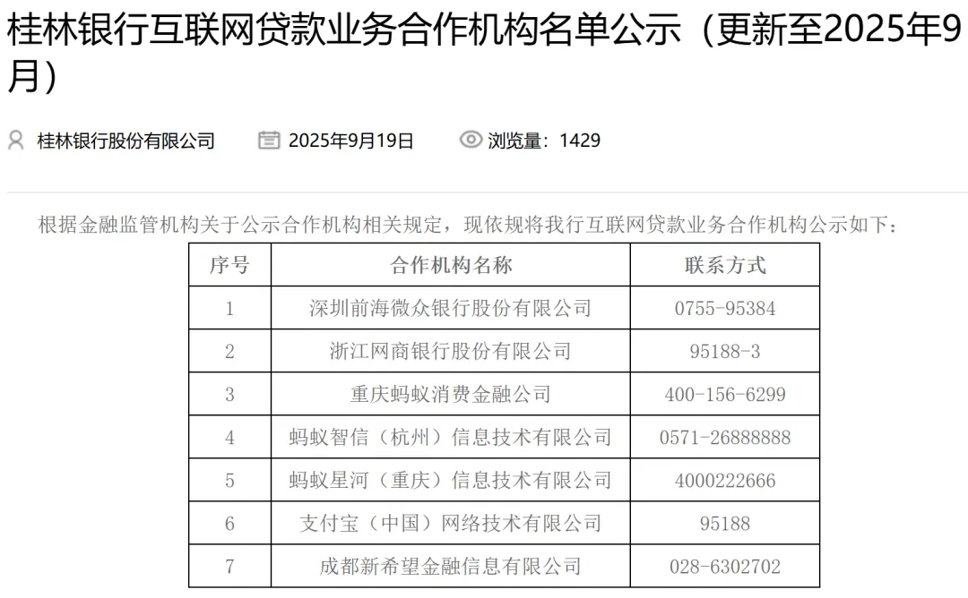 9月19日,桂林银行披露的互联网贷款业务合作机构名单显示,截至2025年9月,该行与微众银行、网商银行、蚂蚁消金、蚂蚁智信、蚂蚁星河、支付宝,以及新希望金融科技合作互联网贷款业务。