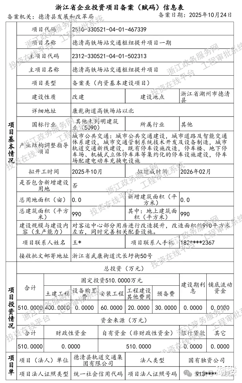 近日,湖州德清高铁场站交通枢纽提升项目一期备案(赋码)信息表公布。