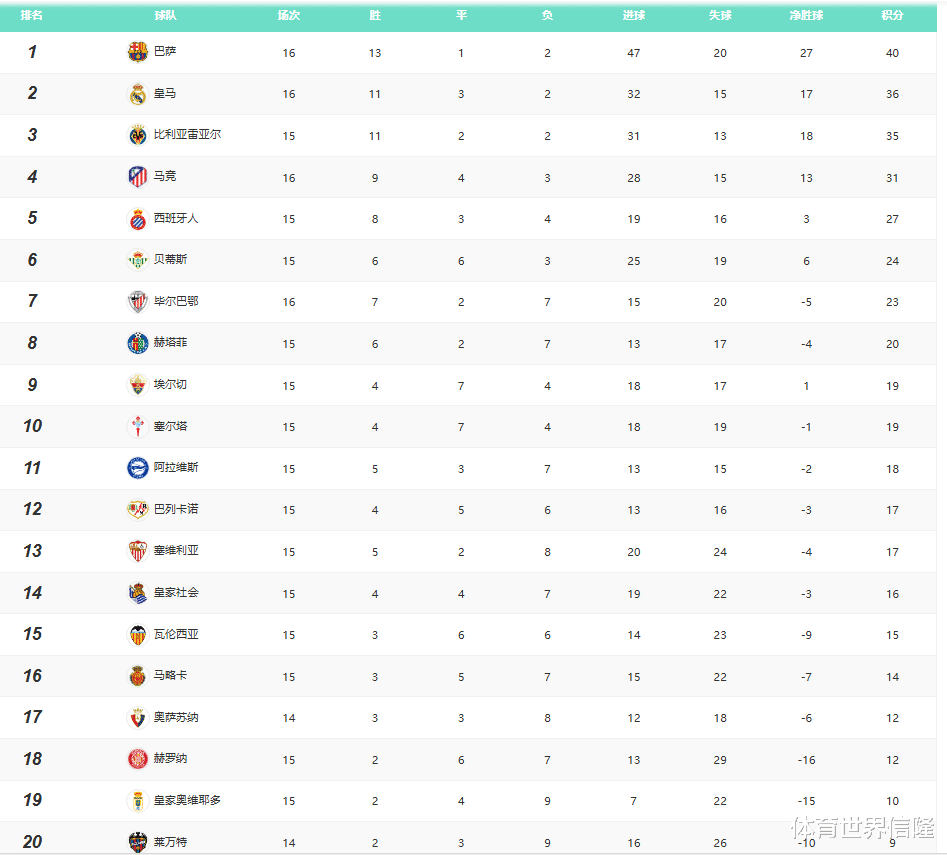 另外两场比赛,比利亚雷亚尔2-0击败赫塔菲,毕尔巴鄂1-0击败马竞;目前巴萨积40分高居榜首,皇马36分位居第二,黄潜少赛一场积35分排第三,马竞31分第四。