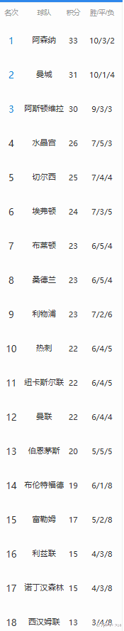 跟西甲相比,本赛季的英超竞争就激烈多了,排名榜首的阿森纳被维拉绝杀,领先优势仅剩2分,维拉赢球后仅落后阿森纳3分排名第三;伯恩茅斯0-0战平切尔西,近期表现不佳的切尔西仅积25分排名第五;曼城主场3-0击败桑德兰,目前积31分仅落后阿森纳2分。