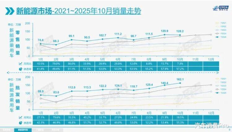 在大力发展新能源的当下,今年新能源渗透率也在逐步走高,已经从1月份的41.4%到9月份的顶峰57.9%,实现了8连涨,10月份的新能源车渗透率也仅略低于9月份。