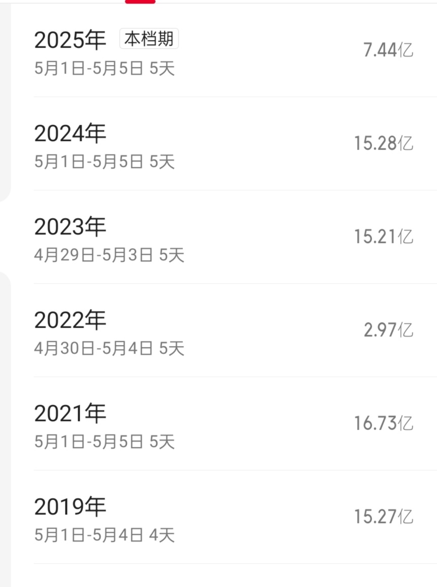 今年五一档总票房约7.4亿,相比前几年可以说是腰斩,大约回到了十年前的水平。(2