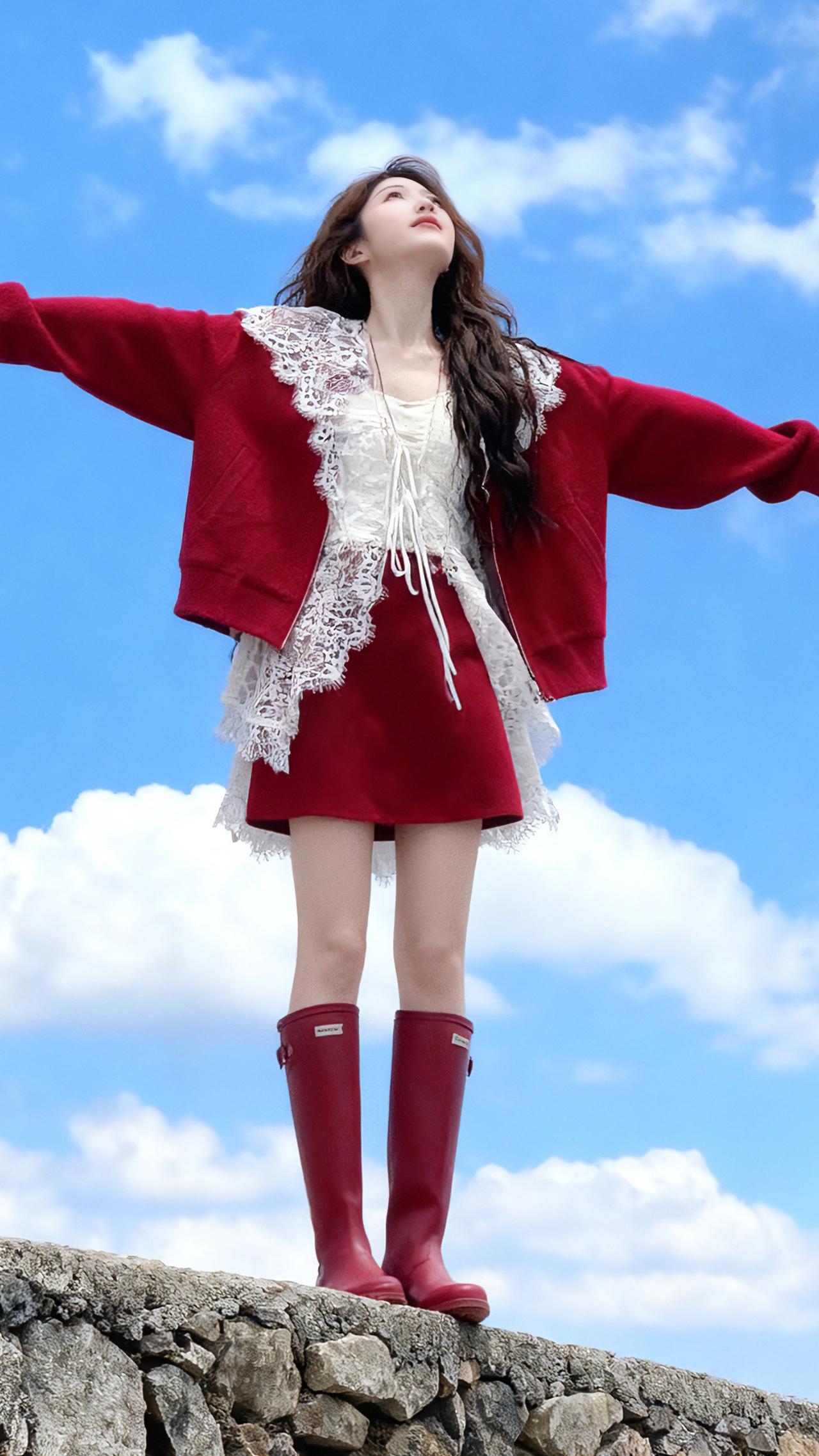 今天是被这套“酒红蕾丝裙”治愈的一天🍷 软乎乎的针织外套裹着蕾丝内搭,甜而不腻