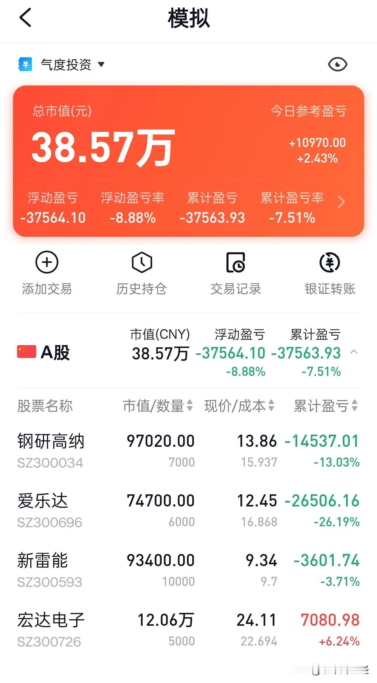 拼运气挣得钱,又为什么会输掉?军工模拟仓位全绿了。还有亏损快30的单票出现,南山