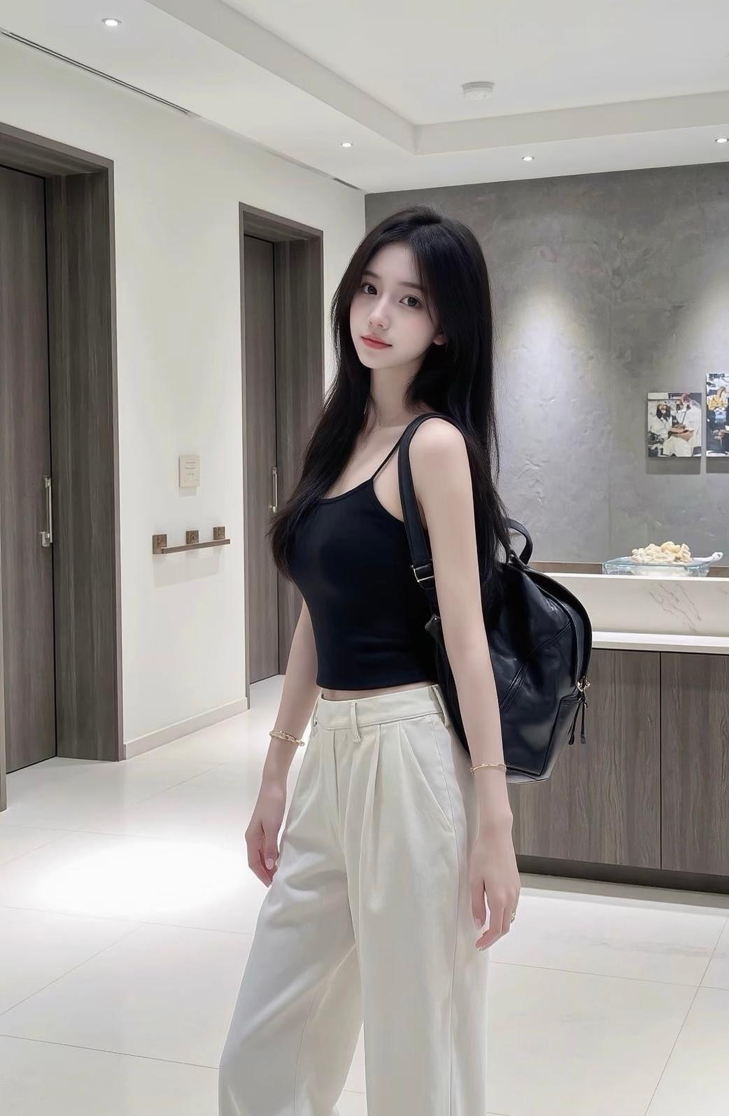 夏日清新穿搭,浅蓝色牛仔裤搭配白色背心,粉色小包点缀,公园里的时尚少女